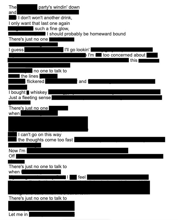Andrew in Uncategorized March 20, 2026 14 Words Redacted Poetry More redacted poetry from song lyrics. James McMurtry’s “Hurricane Party” for brain injury recovery. Share this: Share on Facebook (Opens in new window) Facebook Like Loading...